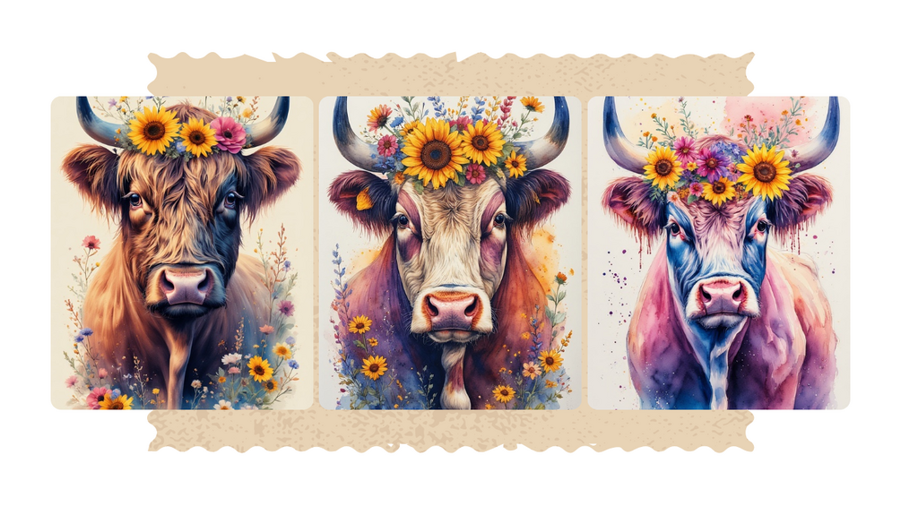 Bring a touch of rustic charm and free-spirited artistry to your projects with this Bohemian Highland Cow Watercolor Graphics Pack. Each piece in this collection features a beautifully highland cow, adorned with floral crowns and surrounded by soft wildflowers—perfectly capturing the cozy, bohemian aesthetic.
